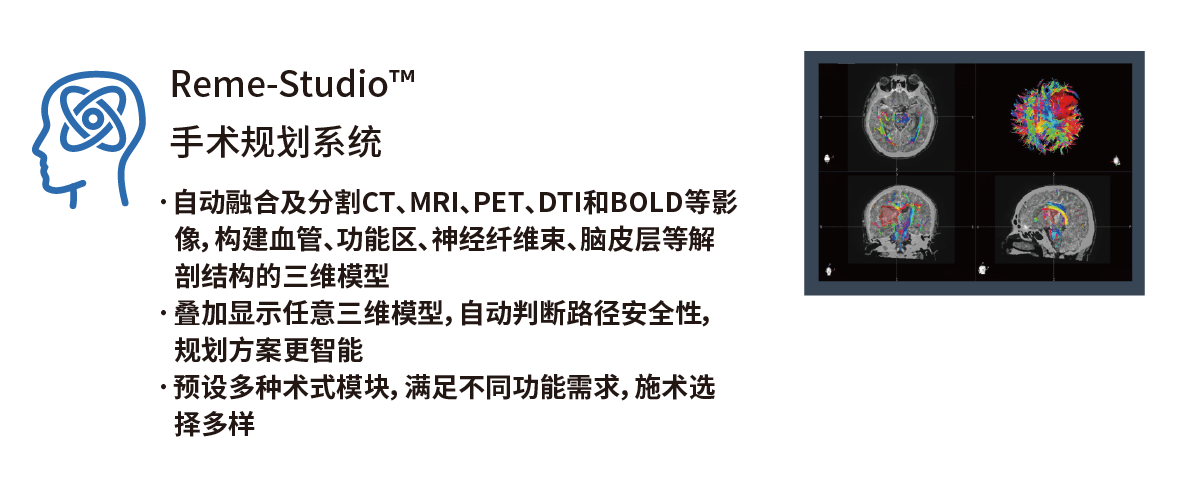 Q:睿米?手術(shù)規(guī)劃軟件包含什么功能?A:手術(shù)規(guī)劃軟件可實現(xiàn)包含CT、MRI、PET、DTI等多模態(tài)影像融合,多種組織分割以及高級影像處理功能,滿足神經(jīng)外科手術(shù)影像處理及手術(shù)規(guī)劃多種需求。